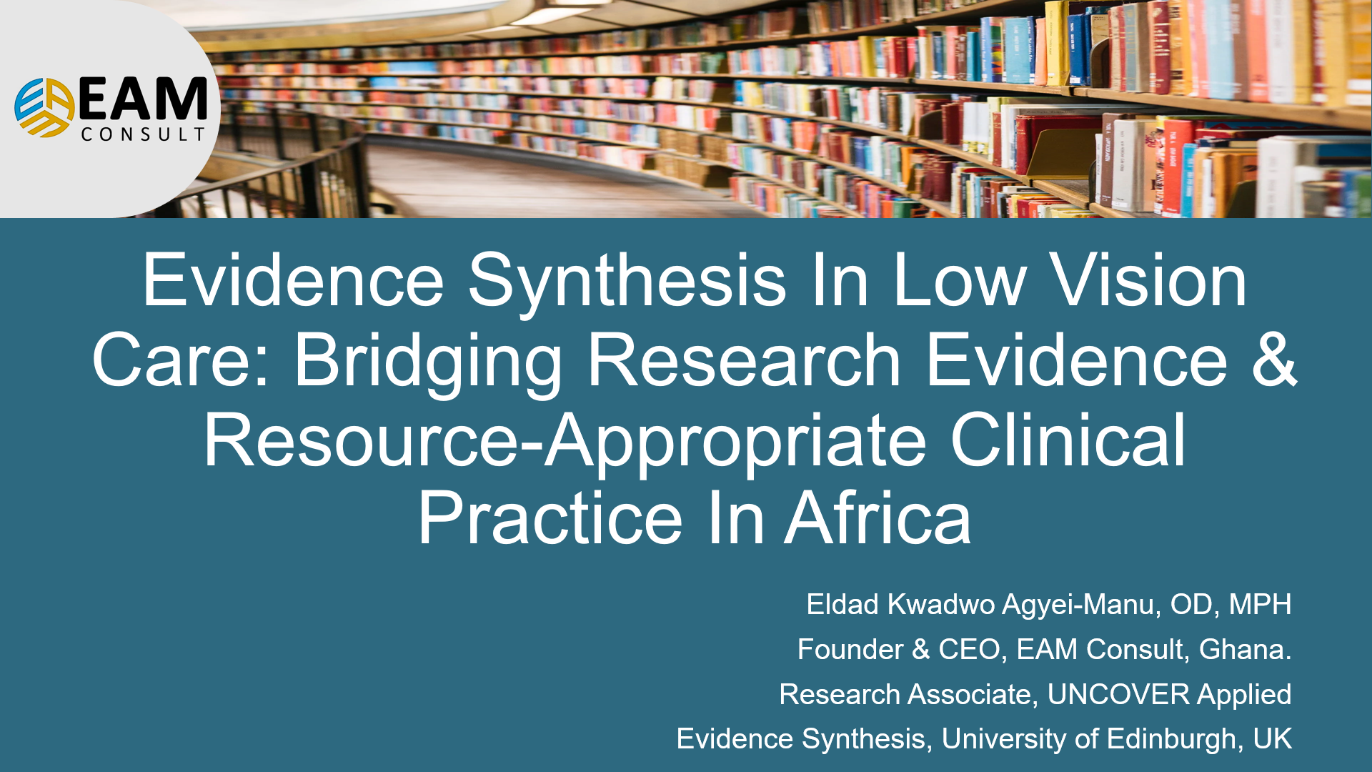 Dr Eldad Agyei-Manu, Founder & CEO of EAM Consult, delivering his guest lecture on evidence synthesis in low vision care