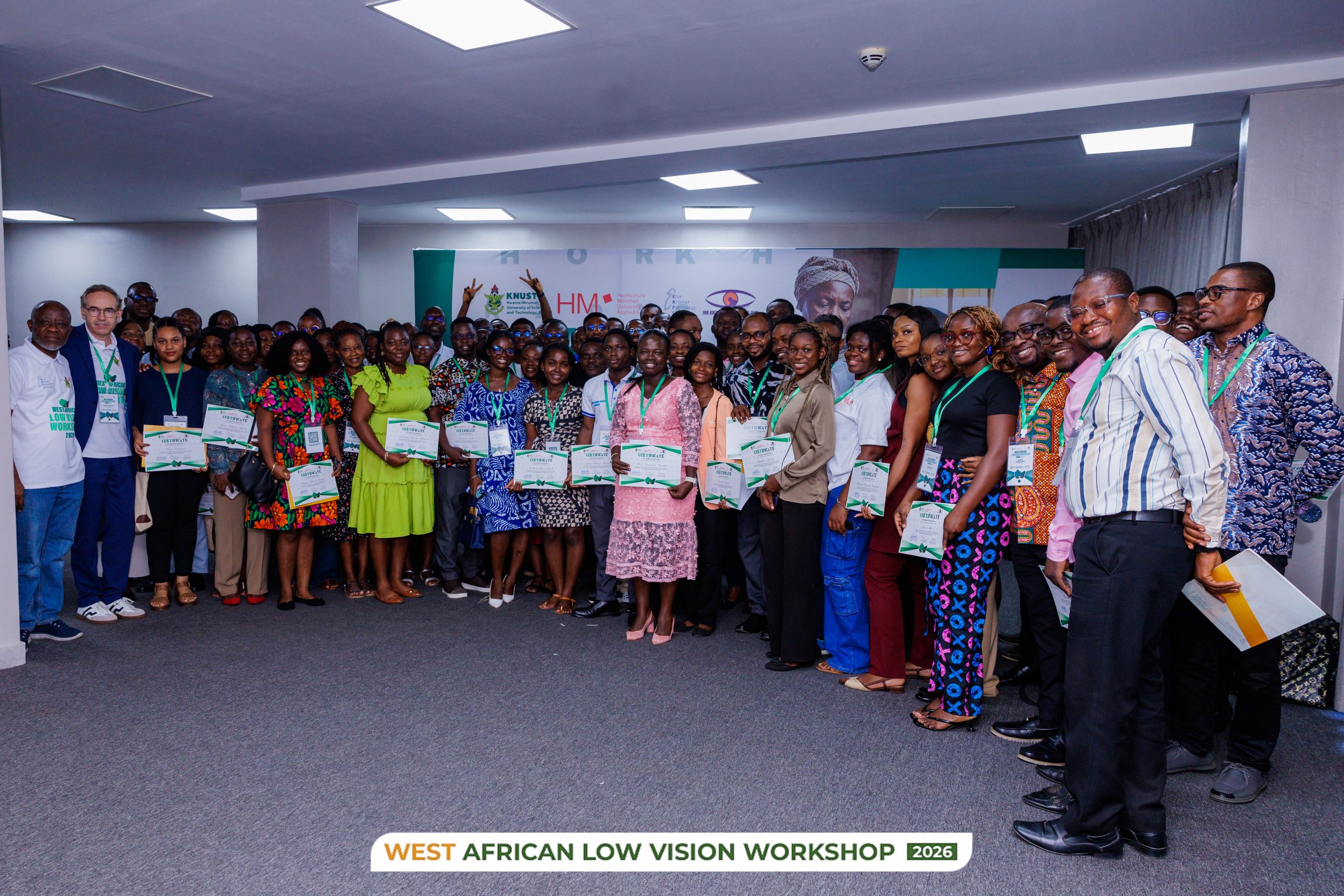 The maiden West African Low Vision Workshop 2026 was hosted at Kwame Nkrumah University of Science and Technology (KNUST), Kumasi, Ghana from 27th February to 1st March 2026. This Workshop was organized as part of the HM KNUST Low Vision Project – a collaboration between Kwame Nkrumah University of Science and Technology, Kumasi (Ghana) and Hochschule Munchen University of Applied Sciences (Germany), with support from Else Kroner Fresenius Stiftung – aimed at enhancing access to comprehensive low vision assessment and care, strengthening the capacity of eyecare professionals in low vision assessment, and promoting research and innovation in vision rehabilitation in Africa.
