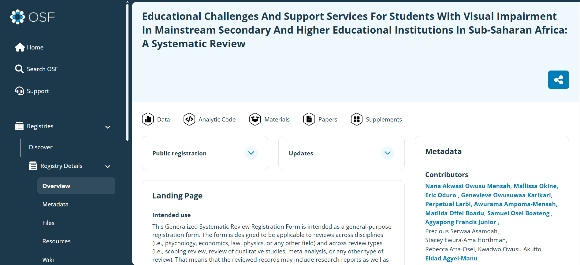 Project title: Educational Challenges and Support Services for Students with Visual Impairment in Mainstream Secondary and Higher Educational Institutions in Sub-Saharan Africa: A Systematic Review”
